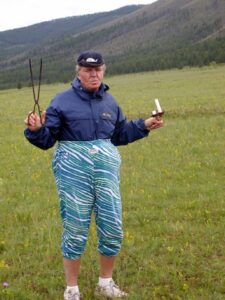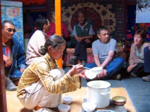 After our morning romp, most of us were ready for an afternoon siesta and we crashed in our respective gers. Alex advised those of us who wanted to visit a neighboring ger to meet back at the restaurant ger at 1600 so we could all stroll over there together. Our dossier prepared us for what to expect on our visit, “The Mongolian way of life is nomadic and intimately connected with the ways of animals. Despite urbanization, the traditions of the steppes live on.” Armed with simple gifts like soap, toothbrushes and toothpaste (nomads have to make a special effort to get such simple commodities), we strolled over to pay a call on our neighbors. Alex had briefed us on several customs relating to a ger (do not step on the threshold as this is very disrespectful, instead bend and lead with your right foot forward over the threshold; men and women are normally segregated inside a ger but since we were westerners, exceptions would be allowed for us; and lastly, while seated inside the ger, never stretch out your legs with your heels pointed towards the central hearth as this shows extreme disrespect towards the spirit of the fire). Duly forewarned with mental notes of do’s and don’ts, we visited a 76 year old man and his wife, who lived with their brother’s young daughter (they had adopted her). Once seated inside the ger, the daughter immediately started preparing plates of cheese and bowls of koumiss (fermented mare’s milk that surprisingly tastes great with a lot of sugar!) Afterwards, a snuff bottle was passed to each of us and we were shown the proper technique to take in snuff.