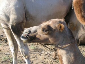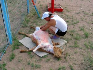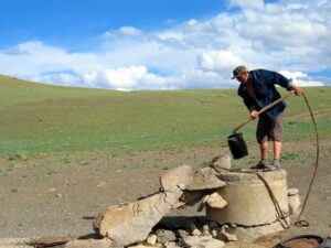 We admired the simplicity of the ger as well as our hosts’ wonderful hospitality. Even though they had not been given any notice of our visit, they were extremely gracious and accommodating. We parted with gifts to the matriarch of the household, extending both hands to give her the gift (as was recommended in our guidebooks). She received the gifts with both hands and a curt nod of her forehead but we could tell that the toiletries were very much appreciated. The daughter was sent outside the ger to subdue the guard dog, which was furious at having strangers desecrate its territory. We do not recommend strolling up to a stranger’s ger without having them secure their dog first, or you will be attacked! We admired our neighbors simple but effective well, which provided ample water for their livestock as well as cooking needs. Our driver demonstrated how to retrieve water from an inflated bladder and we were impressed that the Gobi provided for almost all one’s needs.