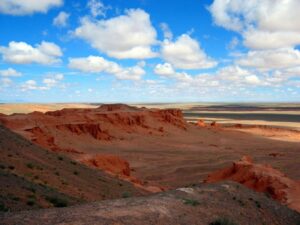 We are happy that the Flaming Cliffs are a short two hour drive away which makes for a perfect break on our arduous journey. Bayan Zag is a Neolithic site where one of the world’s most famous dinosaur scenes emerged (two large dinosaur skeletons on display at the UB Natural History Museum are shown interlocked in a deadly battle to the death. Entitled “Fighting Dinosaurs”, they represent an adult Protoceratops locked in a death struggle with a Velociraptor). Nicknamed “Flaming Cliffs” by the explorer Roy Chapman Andrews, Bayan Zag is the spot where the first dinosaur eggs were discovered in Central Asia. Today, it remains a very popular stop on the tourist trail, with the arid terrain preserving dinosaur eggs that are frequently being discovered by locals and unfortunately sold on the black market. We wonder if they realize that the dinosaur eggs are invaluable national treasures and are disappointed that Mongolians sell these priceless discoveries in an effort to make a buck. We spend about an hour here exploring the magnificent red cliffs and slowly wander back to our bus for the duration of a grueling tour towards Saikhan Oboo.