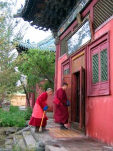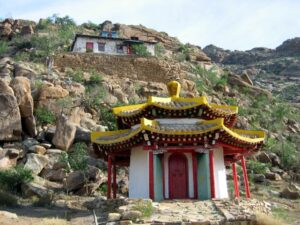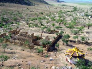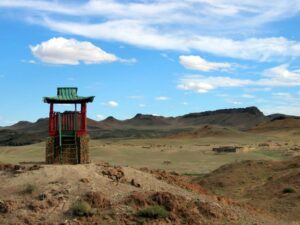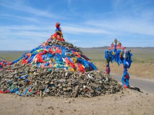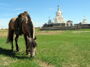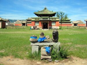 Erdene Zuu is enclosed in an immense walled compound, with 3 temples that are dedicated to the 3 stages of Buddha’s life: as a child, adolescent and adult. The main, central temple is called the Zuu of Buddha and has statues of Buddha as a child. Inside one of the temples is a statue of Bogd Zhonghov, who is credited for spreading Lamaism to Mongolia. We wander towards a functional monastery, where the monks are performing their morning chants and rituals. While it is extremely photogenic inside the monastery, we resist the temptation to take photos as it is considered disrespectful to interrupt their daily services. Instead, we gather outside the monastery and keep an eye out for the occasional red-robed monk scrambling across the complex as we consider him free game. Our group eventually consolidates again and we head outside the monastery complex’s walls to stroll towards Karakorum’s ruins. Originally there were four turtle rocks, each of which marked the boundaries of the ancient city of Karakorum. However, today there are only two stone turtles in existence. Alex tells us that amazingly there are shards of turquoise tile ceramics from Karakorum’s original temples. They are located a short stroll from the turtle and we are able to see thousands of shards submerged beneath mounds of dirt. We wonder if Mongolia will ever undertake the project of rebuilding Karakorum to its former glory but doubt they will, considering how many shards are horded by tourists on a daily basis! Fascinating relics from Genghis Khan’s era, we are amazed that the site is open to the public’s scrutiny.