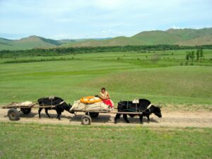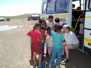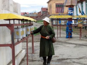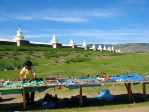 Today is another long day’s journey across the country. We are on our way to Karakorum, Genghis Khan’s ancient capital city. The terrain has changed dramatically since we left the Gobi desert and we now find immense tracts of steppes that are awful for our frequent bathroom breaks. We agree that women pee on the right side of the road, men on the left, no peeking allowed. Since there are no boulders or rocks to conceal us, the women are forced to hold up shirts or jackets matador style to conceal another woman who vainly attempts to pee in privacy. The men pee brazenly out into the open fields and do not have to worry about squatting behind an imaginary rock to maintain their dignity. Frances leads the group in yoga, forcing us into weird positions such as bending dog stance or warrior pose. Those who cannot bend simply look on in amusement and we wonder what the Mongolians must think of our weird contortions alongside the road.