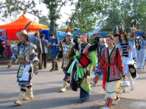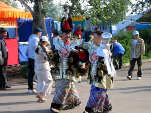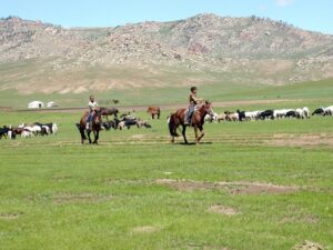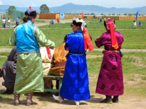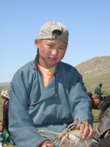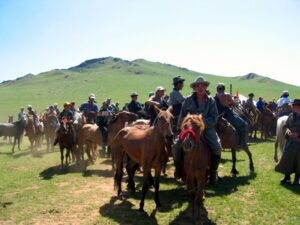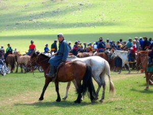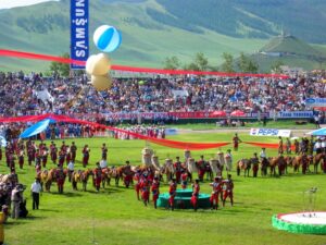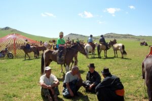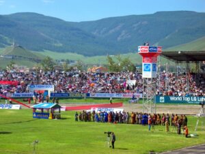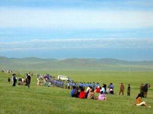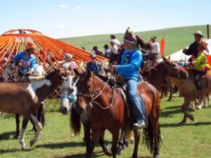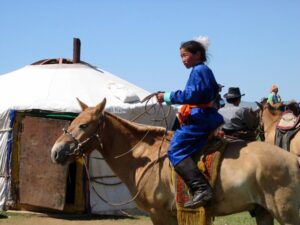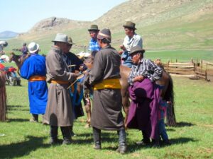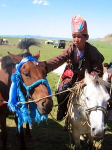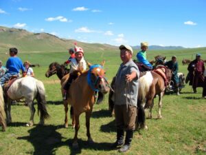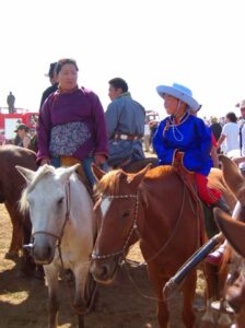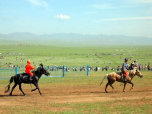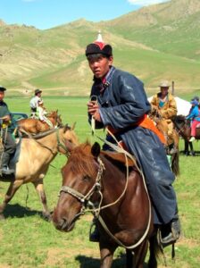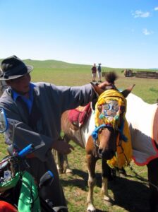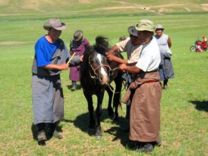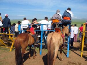 In Claire Sermier’s Mongolia travel guide, we read about how the horses are trained for Naadam. With Mongolians being such avid horse lovers, the Naadam horse races are Mongolia’s most popular, whose winner (the horse, not the rider) earns bragging rights for the rest of his/her life! The horses are trained in a methodology hundreds of years old, with special focus on the horse’s age and speed. The first phase is the “weight loss” phase, which begins three months prior to Naadam. The horse is allowed to graze on the best pastureland but is not allowed to gain weight! This is achieved by adorning the horse with a thick felt blanket, where it is led up a steep slope at the hottest time of the day. The horse’s owners use a long wooden pallet and scrape the sweat off the horse, and this is meant to eliminate excess food and increase blood circulation and muscular activity. This continues for several days until the horse’s droppings become firm and brittle. Afterwards, the horse enters into phase two, the “Tar”. This phase consists of the horse running as fast as possible over the distance of one kilometer. It is designed to train the horse how to develop regular breathing patterns. The distance is gradually increased as the horse gets its breathing patterns under control. Once a certain distance is achieved with the horse’s breathing remaining constant, the horse enters the third and final stage, the “Sungaa”. The Sungaa starts approximately 10 days prior to Naadam, where the horse must run a distance of 10 to 13 kilometers at full speed. Four or five days prior to the race, the distance is increased to 15 kilometers. The horse’s breathing pattern is closely monitored and a determination is made on whether it is satisfactory or not. (Unbelievably, if the breathing is not satisfactory, the poor horse is forced to run at full gallop two or three days prior to the competition!) The last portion of the Sungaa is a full observation of the horse. It must stand in a balanced manner, with its droppings examined to be compact and dry. The animal is not allowed to sweat anywhere near the saddle after the race and the blood vessels located under the horse’s skin and near its nostrils must be visible.