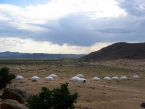 Lunch is spent amid saxaul bushes, which provide a little bit of shade from the relentless sun. It is bizarre that the saxaul bush grows in abundance around Bayan Zag and nowhere else in Mongolia and we are fortunate to spend some time being surrounded by them. After lunch, we have enough time to make a quick stop visiting another Mongolian family, repeating yesterday’s ger visitation routine. Due to the family’s close proximity to the Flaming Cliffs, they are visited by lots of tourists, as evidenced by the family’s proud display of Polaroid photos adorned on chests and cupboards inside the ger. After our visit, we reluctantly board the bus and prepare ourselves mentally for the duration of the trip. It was actually not as long as we had anticipated and well before dinner, we rolled into Saikhan Ovoo Wild Ger Camp. Immediately before the camp, several Argali sheep were proudly posing on the cliff tops. Some of us were tricked into thinking they were real and eagerly whipped out our cameras to capture them on film. It wasn’t until the bus pulled into the camp ground and we disembarked that we realized the sheep had not shifted position at all, and were indeed genuine fakes.