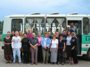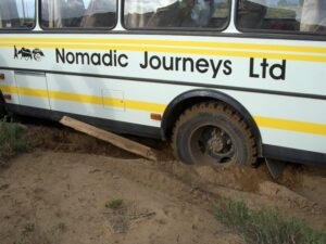 We loaded onto the bus after breakfast and were on our merry way until our bus became stuck in a rut. Our driver calmly urged us to sit tight and attempted to rock the bus back and forth in an effort to get it out of the ditch but to no avail. We had been through tight spots before on the journey and had complete confidence in our driver’s ability but soon it became evident to all of us that we were not going anywhere! We were truly stuck in a tight spot so despite our driver’s entreaties, we hopped out to survey the damage. No wonder we were not going anywhere. The rear tire was hitting a tree stump and the front was wedged against a boulder. Thankfully, we had basic tools on the bus so while Timujin began sprinting back towards base camp to seek some help (our reserve jeep might be able to tow us out of the jam), Robby and our driver decided to take matters into their own hands. Armed with planks of wood, Robby began digging around the buried tires. The ground was not giving way easily so he switched over to the front tire and attempted to roll the boulder away. Our driver appreciated the assistance and the two of them began animatedly rocking the boulder back and forth and finally managed to roll it away. In the mean time, those of us standing around decided to take some funny pictures of the entire event. The driver had attached a wire cable to the front of the bus in preparation for the upcoming towing. We thought it would be a riot to pose along the cable in various positions of strain, as if we were playing tug of war against the bus. However, our driver misread our attempt at humor and truly believed we were all trying to pull the bus out. So he hopped into the driver’s seat and gunned it hard. We couldn’t believe what was happening! Despite the fact that all of us were barely holding onto the tow cable, slowly but surely that bus started rolling forward. Once we were unstuck, our group let out a big cheer and continued on our way. Our proud driver was beaming from ear to ear, satisfied with our group and steadfast in his belief that we had “towed” the bus out. However, our group consensus attributed our rescue to Robby’s effort to dig up the boulder along with the power of persuasion: once our driver saw a dozen folks pulling the tow cable, he really believed the bus could be pulled out.