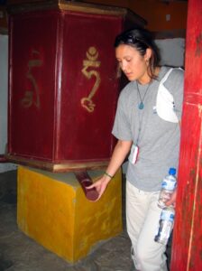 The lady abbot was present to receive us and our group was in dispute as to whether we should continue without Tim or wait for him to arrive by jeep. Most of us were willing to wait although we were being pushed to start the tour without him. We compromised by deciding that we would start the tour after briefly shopping at an arts/crafts store located on the monastery grounds. Some beautiful water color and oil based paintings were purchased, along with Alex’s silly felt hat which she stated would fit right at home back in England. After delaying as much as we could, we finally started our tour. Sure enough, a short while later Timujin emerged from the jeep to catch up with our group.