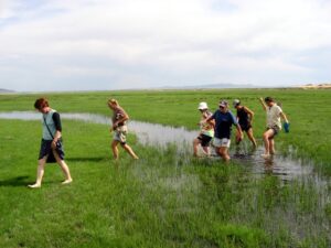 That afternoon, Alex asks us if we’d like to join her on an excursion to a nearby lake, so we can admire the birdlife. We all agree and pile onto the hot bus. A few minutes later, we are at the edge of what seems to be a marshland and Alex instructs us to walk straight ahead to reach the lake. However, as we walk through the fields, it’s like we are all bit actors in a horror flick because hundreds (if not thousands) of frogs/tadpoles are everywhere on the ground. Where they have come from is not know and we do not see any birds of prey feeding upon them. The frog population is way out of control and we know that with every step we take, we are killing some of these poor creatures as they cannot possibly escape our intrusive footsteps. What is frustrating is that no matter how many hapless frogs we kill, we are no where nearer to the invisible lake. Finally we give up dejected and as we make our way towards Timujin and the awaiting bus, he grins and points towards another direction and tells us that the lake is located there. Alex explodes in anger and asks him why he let us wander around aimlessly in the marshland and he shrugs it off, saying he was wondering why we wanted to “walk with the frogs”. A few of us are determined to see this lake and finally find it but most folks are waiting by the bus, ready to head back to base camp.