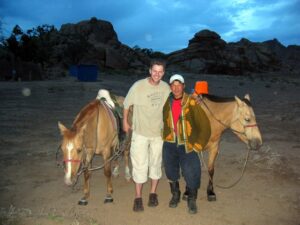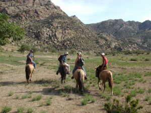 While Tim and Alex were coordinating our day passes into the Yol valley, we all had some free time to kill and decided to spend it wandering through the Yol valley’s biggest souvenir strip: a series of ger shops arranged in a row that touted Mongolia’s biggest stamp collection, hand woven camel hair socks, scenic paintings and the like. Shopped out to our heart’s content, we boarded the bus for a short journey to the entrance of vulture valley, where a group of horsemen and camel herders were awaiting our arrival. Five brave souls decided to try riding horses Mongolian style. What this means to the average Westerner is “riding in extreme discomfort” as the riding saddles are made of wood and are very, very small. You are only able to ride the horses if you manage to squeeze your pelvis up into this torture device and urge your horse forward with a forceful “chooo, choooo” command. After a few excruciating minutes, Bob managed to convince Alex to switch horses (she had a coveted western style saddle and Bob could not handle his Mongol saddle anymore). Lisa, Rich and Roy seemed to enjoy their trot through the valley and the rest of the group vowed to have a go at Mongolian horseback riding once we were out at Jalman meadows.