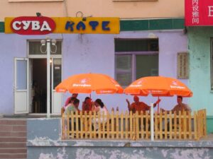 Even though all of us were extremely tired, we were happy that Alex had arranged such a nice first evening together. We were ready for some sleep though and caught taxis back to the hotel for a few hours of rest before our early morning flight to Dalenzodgad (South Gobi Desert) tomorrow. Day one has left us with vivid impressions of UB. Our initial feel for Mongolia’s sleepy capital is that is has the atmosphere of a neglected 1950s European city. The old soviet cars and buses are slowly being replaced by newer Japanese versions, but cows still wander the roads, goats sift through rubbish, and monks dressed in red/orange cloth walk alongside traditionally dressed men and women, as well as the city’s fashion conscious nouveaux riche.