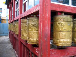 We start our morning tour learning that Erdene Zuu (which means “hundred treasures”) was the first center of Lamaism in Mongolia. While construction on the monastery commenced in 1586, it took over 300 years for it to be completed. In its heyday, there were between 60 to 100 temples inside the complex, as well as 300 gers and over 1000 monks in residence. However, Karakorum’s curse hit and the monastery was abandoned and vandalized by invading Manchurians. Sadly, during Stalin’s purges, all but three of the existing temples were destroyed and an undetermined number of monks murdered. From the 1930s until 1965, Erdene Zuu remained closed and off limits, but in 1965 the political climate shifted enough to allow Erdene Zuu to be reopened as a museum only, with religion forbidden from being practiced. Once communism fully collapsed, Erdene Zuu was reopened as a monastery, although today it is nowhere close to its original grandeur.