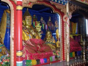 We were off this morning to Jalman meadows, which promised to be one of the highlights of our tour. First, we made a brief stop at Gandan Monastery, one of Mongolia’s best preserved temple complexes. Gandan is well known for being the largest and most important monastery in Mongolia. At the start of the 19th century, there were over 100 Tibetan Buddhist sum (temples) and Khiid (monasteries) that served the 50,000 residents of UB. Unfortunately, during Stalin’s infamous purges in the 1930s, most of these beautiful temples/monasteries perished, along with their inhabitants and priceless belongings. What sets Gandantegchinlen Khiid apart is that the communists decided to keep it intact as a showcase to impress foreigners of their “religious tolerance”. Therefore, most of the buildings at Gandan are original and it remains one of UB’s most amazing sights. The translation of “Gandantegchinlen Khiid” means “the great place of complete joy” and it is indeed a joy to explore the many temples. There are approximately 150 monks who live and worship here, and we were in time for the early morning incense burning and prayer rituals. The temple complex was truly brought to life with their chants and cadences. We had plenty of free time to explore the complex so we wandered through and marveled at the temples adorned with gold and jewels. The most fascinating temple is the Mejid Janraiseg (Avalokiteshvara) temple. It is a blend of Chinese/Tibetan architectural styles and has an unusual height to accommodate the 25.6 meter tall standing deity. The original deity was disassembled in the 1930s by the Russians who sent it piecemeal to the USSR, but the replica standing there today was funded by donations from Japan and Nepal. It is a hollow statue, containing a storehouse of sutras, medicinal herbs, bundles of Buddhist mantras and even an entire furnished ger inside it! After we had wandered through the Gandan complex at our leisure, Alex herded us onto the bus for our drive out towards Jalman meadows.
