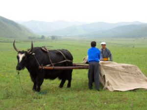 We made another pit stop to have lunch out in an open meadow and felt a light drizzle coming down on us. Another hour on the bus brought us to the dense forest of the Khan Khentii Protected Area (beyond the Terelj National Park). Our ger camp, Jalman Meadows Ger Camp, was located in a remote location next to the Tuul River and we were informed that it was an environmental friendly camp that ran on solar power and windmills. The camp ground was truly wonderful. A yak driven cart brought us our luggage and one of the gers had been converted into a library, which was full of wonderful books/magazines on Mongolia. Because the rain was coming down incessantly, we hid out in our gers and sought refuge at the library. Warm tea was a welcome distraction and Alex informed us that due to the recent wet weather, the river was over-swollen and tomorrow’s water rafting had to be cancelled due to safety reasons. Alex suggested a game of skittles and we agreed, intrigued. Skittles ended up being a fun game that consisted of round pegs and square pegs. The square pegs were mounted into the ground and each team stood behind their respective square pegs, attempting to hit the other team’s square pegs with the round pegs. We had a couple of ‘in the closet’ skittle fans, with Richard donning his university’s skittle’s mascot outfit (inverted baseball cap, funky green/blue striped pants, a candle stick holder and prongs) and the demure Ann killing the opposing team with her skittle skills. Rich’s team dominated after a few close calls and the winners happily guzzled some wine while admiring the beautiful view surrounding our camp. Dinner was served in a relaxed setting and the library got a good workout, with folks avidly reading up on Mongolian tidbits.