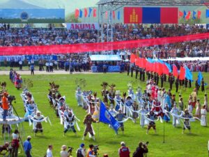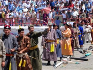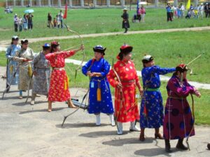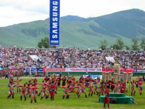 Upon the conclusion of the opening ceremonies, Mongolian style wrestling kicks into full gear. For some strange reason, the tour groups are heatedly rushing their groups out, in an effort to catch all three events in one day! Some background on the Naadam festival: it is the biggest event of the year in Mongolia. Known locally as the “Eriyn Gurvan Naadam”, it stands for the three ‘manly’ sports of wrestling, archery and horse racing. The festival is held annually between the 11th to the 13th of July, which is the anniversary of the 1921 Mongolian Revolution. Mongolians from all over the country traverse rough terrain to converge on the capital to witness Mongolia’s National Games. Horse racing, wrestling and archery are the three age old competitions which traditionally measured the courage, strength and daring of nomads and warriors alike. Wrestling matches are run amongst several competitors simultaneously and end when the first elbow or knee touches the ground. Legend has it that a woman once won a wrestling match, humiliating her male opponent. Because of this, the wrestling costume has been modified to portray the chest in an open fashion, with a closed back. Therefore, no female could ever again trick her way into competing in the ceremonies. The other two events, archery and horse racing, are open to both male and female alike, with the horse races arranged and competed in categories of the age of the horse! All three competitions conclude in a colorful and spectacular awards ceremony for the winners.