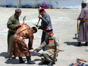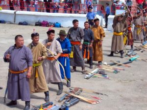 Next on our itinerary is the archery event, which starts at 1400. The heat beats down on us and we have a few minutes to wander around the stadium stalls to shop and talk to the locals. Timujin leads us over to the archery stadium, which is adjacent to the main stadium. The archers are dressed from head to toe in traditional garb, slinging their bows and arrows and aiming towards their targets downrange. Historically, the targets were live marmots, but today’s version is a lot more humane with the targets being fist-sized baskets. They are compact and red, and whoops of happiness erupt whenever an archer’s arrows make contact with them. Adjacent to the archery stadium is a makeshift tent where bouts of laughter, loud conversation and music emanate. Becky and Robby peered in curiously and were pleased to find teams of Mongolians totally engrossed in a local sport known as “bone shooting”. This game consists of participants flicking sheep ankle bones at a target of stacked bones about 10 feet away. The players were focusing their full efforts on hitting their respective targets and this venue proved extremely popular with the locals. The heat beats down relentlessly so our group dwindles down as folks lose interest in the games and decide to spend their time wandering through the many stalls or shopping downtown.