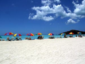 Jolly Beach has some of the most unbelievable colored waters in the Caribbean. Its located on Lignum Vitae Bay, and one of our travel brochures described it as the following: “Bring decent sunglasses to iridescent Lignum Vitae Bay, about 10 miles SW of St John’s. Not only can the brilliant white sand of its beaches turn your pupils into pinholes, but so can the reflection of the pale flesh of the roasting masses. About a mile long, Jolly is split almost in half by a narrow canal. On the Southern side are a couple of resorts. On the northern half is a public-access area known as South Beach, which accepts frequent deposits of cruise ship passengers and borders a development of shops, restaurants, condos and a marina called Jolly Harbor.”