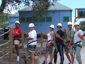 Our day’s agenda included the rainforest tour in the am, followed by an early afternoon at Shirley Heights’ Sunday barbeque. The Zip Line tour is advertised as “Antigua’s Greatest adventure ride in the heart of the rainforest…including 9 zip tours and one challenge course (Cat Walk, Elvis Dangle, Wobbly Bridge, Islands in the Sky, Burma Bridge dam, and Leap of Faith, a controlled 36’ decent). Entrance price is $85 a person for just under 3 hours of fun per person. (For more details, visit their website: www.antiguarainforest.com or call Tel: +1 (268) 562 6363/64).