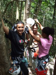 Benji pulled up on time for our morning excursion. We piled into the van and drove on down towards Fig Tree Drive. The Rainforest reception center was very well organized. After we had signed our liability waiver forms and paid for the tour, we headed down towards the zip line center to get our gear on. Armed with our climbing harness, helmet, gloves and carabineers and pulleys, we watched as our guides demonstrated the proper form we had to position ourselves in at each Zip line station. The goal was to sit as upright as possible, with our dominant hand positioned to brake if need be.