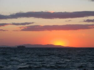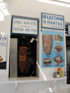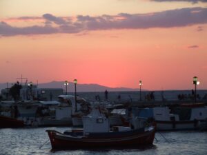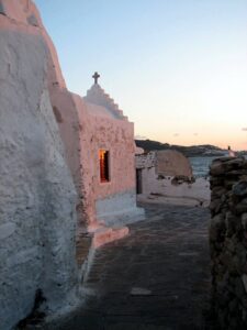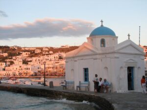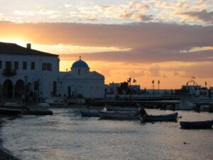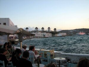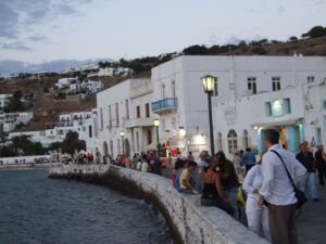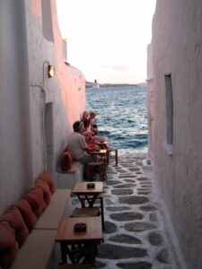 The gentle Aegean Sea seemed like a great place to recuperate from our excessive drinking activities, and Becky went in search of some food for everyone. Armed with four kebabs a short while later, we all managed to wolf down some food to combat the alcohol. Dusk was fast approaching in Mykonos, and the sky turned a lovely hue of pink, orange, and red. Becky went off to join the crowd gathering at Little Venice to watch the sunset…what a spectacular view. By the time she rejoined Bob, Ann, and Robby, they were ready to resume their partying. Everyone except for Ann…who felt waves of revulsion at the mere mention of alcohol. What a difference from earlier in the afternoon when she was chugging down ouzo like there was no tomorrow!