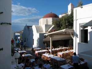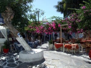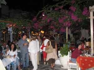 For dinner, we decided to split up into two separate groups, as Bob and Ann were thinking about calling it a day, and Becky and Robby’s night was just getting started. Dinner consisted of grilled octopus (yummy), a Greek salad, and lamb chops. It was simple and delicious, and wallet friendly. Afterwards, we joined the merry revelers in the numerous surrounding bars and clubs whose patrons sometimes cascaded out into the lively streets to continue the party there. What a fun night of dancing up a storm. How those girls managed to get atop the narrow tables for a bit of table top dancing is beyond us, but we watched as a whole lotta tourists enjoyed all that Mykonos has to offer.