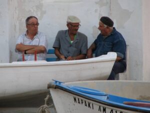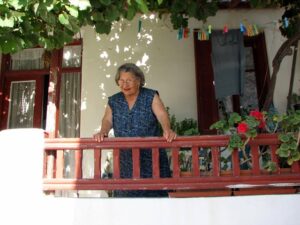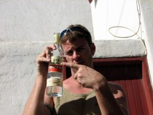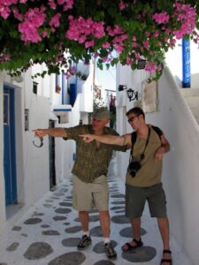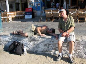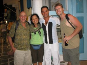 Two bottles of ouzo later, we found ourselves on some steps overlooking Plateia Manto (taxi square). Bob was telling Vietnam War stories, Ann was chugging down ouzo like it was water, and Robby and Becky were laughing at everything and everyone. Perhaps these tell tale signs were only too obvious to the locals, because a young man named Panos unlocked his nearby, first floor bathroom, and invited us to use his facilities instead of making a mess on the stairs. Sure enough, the ouzo took over a short while later, and Robby and Ann were both praying to the porcelain goddess in no time at all. Panos’s grandmother appeared on the balcony above, concern written all over her face as she witnessed four drunken Americans creating a scene beside her lovely home. She promised to whip up a “Mykonos Miracle”, which she vowed would cure our hangovers. A couple of minutes later, four cups of hot black coffee were served, and grandma insisted that we down the coffee in its entirety. What hospitality! Only in Greece would the locals be so completely gracious and understanding of a bunch of rowdy foreigners creating a scene right beside their home. We apologized profusely for disrupting their quiet afternoon, but Panos and his grandmother took it all in stride and told us not to worry.