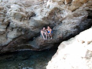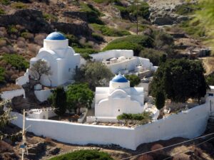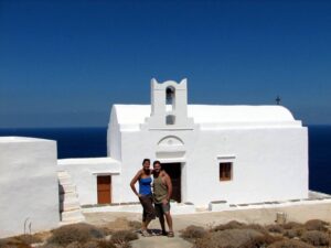 Our picnic consisted of red wine, Sifnian cheese, fresh bread, sausage links, fresh cucumbers and tomatoes, and it just hit the spot. Afterwards, we could tell that Bob would have liked nothing more than to take a siesta in the shade, but we were keener on exploring Kastro. So we compromised and left him at a local bar to enjoy a beer or two, while we wandered around Kastro’s quiet little village. After walking the town’s periphery walkway, we noticed a footpath towards the Seven Martyrs’ Church, and we could tell this was a popular spot for cliff diving. After linking back up with Bob, we decided his driving privileges had been revoked (too much wine and beer!), and Robby lumbered behind the driver’s seat, taking us south towards Platis Yialos’s Panagia Chrysopigi Monastery.