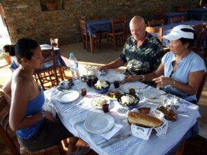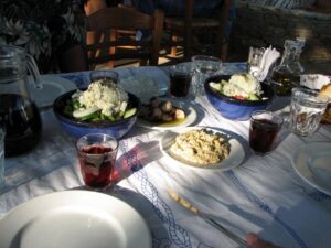 One of our Greek guidebooks had this to say about Manolis, “The best clay oven food on the island. If you are lucky he may be roasting a lamb. Manolis has been the heart and soul of Vathi for decades. Though his son Stelios has taken over the running of the restaurant, Manolis is always there acting as host and ambassador of kefi. A truly wonderful restaurant that should not be missed, particularly for a late and lingering lunch. Excellent wine from the barrel, baked foods from the oven, fried calamari, whatever fish has been brought in, and the best Greek salads in all the Cyclades topped with arugula and mizithra, a Sifniot cheese less sharp than feta and the consistency of cottage cheese.” We found our way to the sandy bay of Vathi with ease, and Manolis was right on the waterfront. Unluckily for us, the grill wasn’t fired up today, but we did have the option of clay pot lamb and chicken, which we opted for, as well as the house salad, boiled octopus, red wine, tsatsiki sauce, and eggplant sauce which was quite tasty. The clay pot lamb was so tender it fell apart, and we left Vathi Bay feeling mightily stuffed.