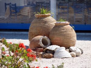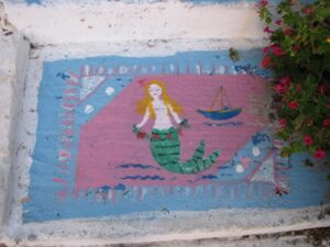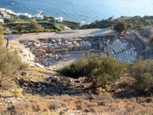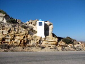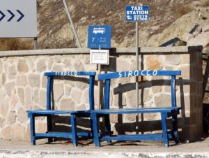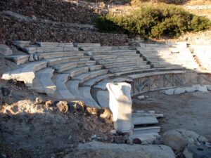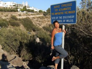 After drip drying in the sun, we figured we’d head over towards Paleochori to check out what had been touted as Milos’s best beach. It was long and sandy but just OK…we definitely enjoyed Tsigrado Beach more. Next beach on our agenda was Sarakiniko, which had lovely white pumice rock formations, a cave complex, and a shipwreck on the rocks just around the bend. Bob really wanted to explore the cave, but since time was a-ticking, we decided to forego the cave explorations for Tripiti’s ancient Roman amphitheatre. Navigating through Tripiti’s narrow streets was quite a feat, and we were glad we rented a compact car. While walking on the footpath towards the amphitheatre, we came upon a signpost that marked the spot where Venus de Milo was uncovered. If you want to see the sculpture today, you’ll have to visit Paris’s Louvre Museum.