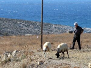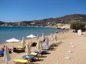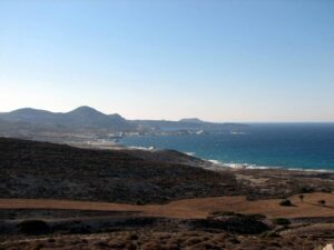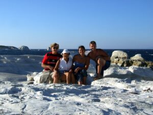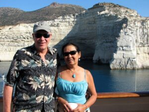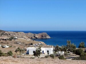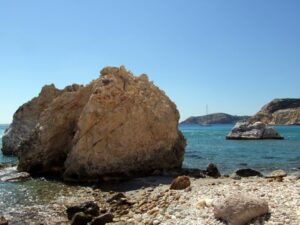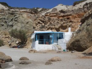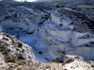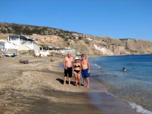 14 Sep: Milos had long been anticipated on our Greek Island itinerary especially after our cruise director, Dario, mentioned that it was his favorite stop on the 2 week circuit. After a bit of research on our own, we decided to rent a car and spend the afternoon on a whirlwind tour to explore Milos’s beaches (Papikinou, Provatas, Firiplaka, Tsigrado, Paleohori, and Sarakiniko), visit Tripiti’s ancient Roman amphitheater, discover the site where Venus de Milo was uncovered, and watch the sunset from the Plaka’s Thalassitras Church and Frankish castle. Quite a busy agenda, especially considering we weren’t able to get off the cruise until noon! By 1210, we had already rented a car from KozzMozz rental for 40 Euros/day, and we pulled back into Adamas harbor to pick up Bob and Ann. Since we had decided on a picnic lunch for the day, we pulled up next to the first supermarket we saw in Adamas and bought cheese, sausages, taramasalata (a pink puree of fish roe, oil, and lemon juice) spread, and a 5 liter box of dry red wine (one of the best bargains we saw in Greece as it was priced at only 9 Euros). The supermarket didn’t have any fresh bread, but the salesclerk readily pointed out a nearby bakery where we were able to get a fresh loaf of bread. After ensuring we had everything necessary for a decent picnic, we headed south out of Adamas and passed Papikinou Beach. It looked like a long stretch of empty beach, but the wind was blowing strongly, and we figured we’d get more shelter from the wind on the south side of the island.