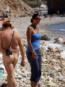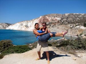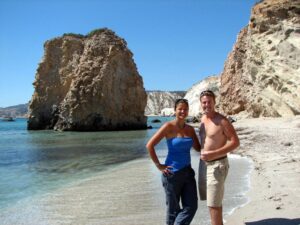 Our first stop of the day was at Provatas beach, which had a nice stretch of golden sand. While we wanted to jump in the water, we figured we’d hold off for a while until our next stop, which was Firiplaka Beach. The view overlooking Firiplaka was absolutely amazing! We had read about Milos’s dramatic terrain and crazy rock formations (due in part to its volcanic origins), but seeing it for ourselves firsthand was awesome. We decided to have lunch here at Firiplaka, and afterwards, wandered down the entire length of the beach. Little did we know that a nudist colony appears after a break in the rocks further on down the beach…we kept walking and walking and then hello! It wasn’t a big deal, just a surprise and we decided to stop taking photos of the dramatic landscape as we didn’t want anyone to think we were taking photos of them! Except for Robby who took a cheeky shot (literally) of a naked guy walking past Becky who is trying her best to avert her gaze.