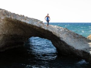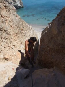 Afterwards, we headed over to the neighboring beach of Tsigrado, which was absolutely the best find of the day. To get to the beach, you have to hold onto a rope and lower yourself down the craggy rocks. We were rewarded with pristine turquoise waters that felt absolutely refreshing and wonderful. And we really did need to take a dip after climbing down to Tsigrado Beach as the wind had blown up a sandstorm on our way down, and now every single one of our crevices was filled with sand! Robby found an underwater passage off to the right of the beach amongst the rocks embedded in the water, and we took turns holding our breath and swimming through…it was a ton of fun.