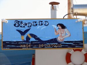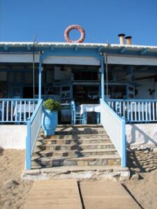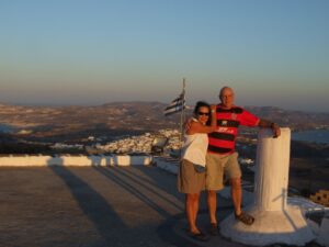 Plaka is about 5 km uphill from Adamas, so we navigated downhill in the dark towards our awaiting cruise. After dropping off our beach supplies and returning the rental car, we headed right back out for dinner at Flisvos. Flisvos has a fish taverna and a psisitaria (grill house), so we ordered a mixture of seafood and grilled meat, along with the obligatory tsatsiki, Greek salad, grilled octopus and beer. The pork souvlaki here was delicious, but both Bob and Ann said their seafood dishes were nothing to write home about. Ann was also bothered by the smokers next to our table, so she ate in a rush and did some window shopping in Adamas while the rest of us finished our meals.