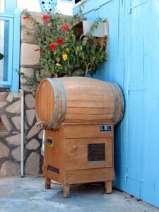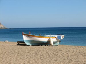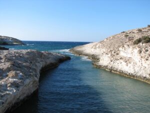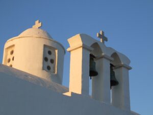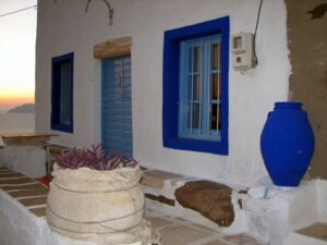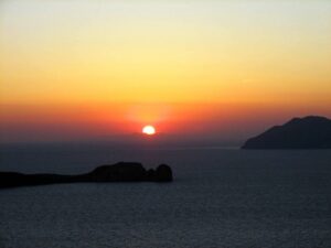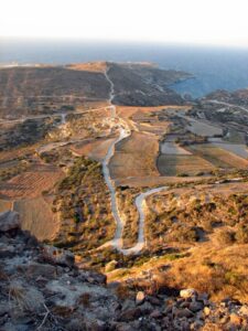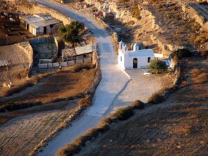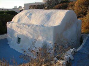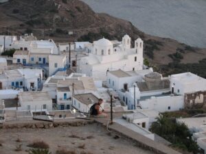 The view from the Roman amphitheatre was quite magnificent, although given the state of the crumbling ruins, we weren’t sure if concerts are performed from this lovely location. Since we had already checked with the tourism office and knew that the Christian catacombs were off limits due to ongoing renovations, we just saw them from a distance and made our way up to the old town of Plaka. After parking our car in the tiny town parking lot, we strolled past Plaka’s white houses and made our way through its labyrinth streets up to the castle. The walk uphill to Plaka’s Thalassitras Church was fairly straightforward, but we wanted to get up to the Frankish Kastro (castle) for the mesmerizing 360 degree view. This was definitely the place on Milos to watch the sunset! As the sun’s last rays of light painted the Thalassitras Church, we felt pure contentment at another beautiful day in paradise.