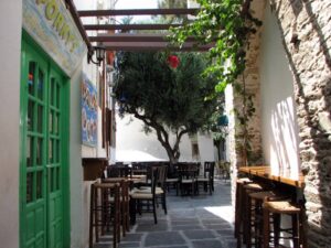 We met a British woman who vacationed every year on Ios and she told us that in August, there were over 20,000 tanned bodies jammed together on the beach as it was peak season and everyone was in party mode. She preferred visiting in the middle of September as the parties were dying down, and she could enjoy her beach days sans crowds. Since she had been on Ios for a couple of weeks already, she gave us the scoop on what had been going on in Ios lately. First, no Thai food at Ali Baba’s anymore as the restaurant had recently suffered from a fire, and was no longer open for business for the remainder of the season. Second, if we were in the mood for Thai cuisine, she recommended Delphini’s as they had two Thai chefs who were excellent. (Lucky for us, Delphini was right there at the edge of Mylopotas beach, so we didn’t have far to walk!) Third, she said nightlife in the hora didn’t really get rocking till about midnight, but we would have fun no matter what. It was great advice, and we were looking forward to taking her up on it.