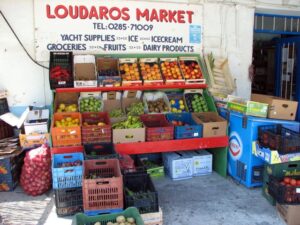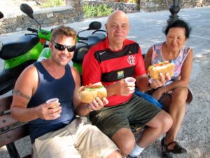 After meandering through the entire village, we hopped back on our scooters and headed for Aegiali’s beach where we decided to take a break for lunch. We scoped out two benches beneath a shady tree and set up our picnic of red wine, tsatsiki, fresh tomatoes and cucumbers, sausages, cheese and combined it all to make a tasty meal.