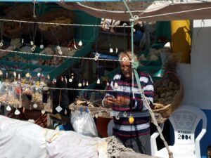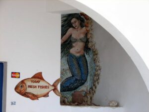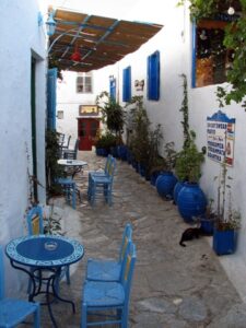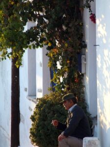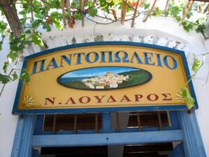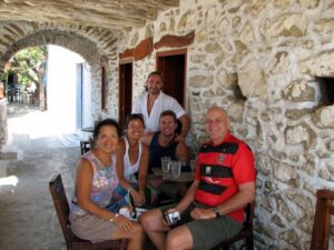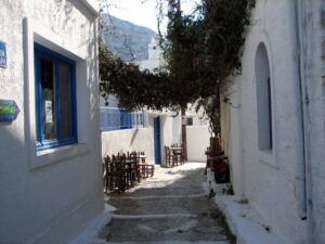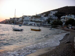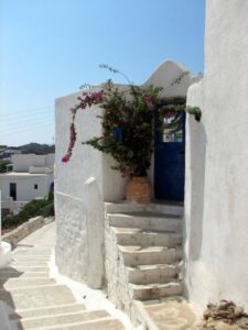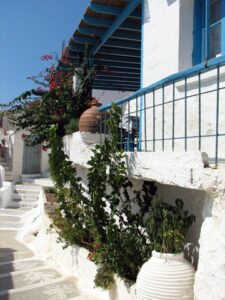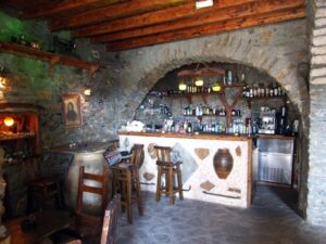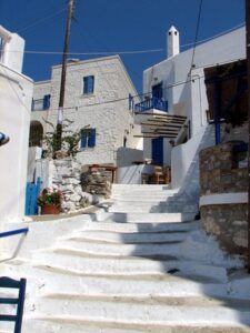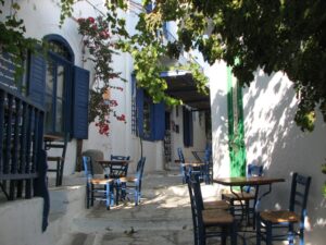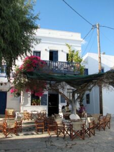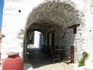 We wandered through town until we came to an old stonehouse – cum – bar which had been lovingly restored named “Pakezo”. The old wooden beams and stonework made for a rustic, charming look, and we decided to stop here for several shots of raki (a regional drink of the island of Amorgos that is made from raki and sugar). The plain raki shots were quite strong, but the sweetened raki was delicious and savory. We didn’t want to stagger out of there (as we still had a lot of sightseeing to do!), so we bid farewell to the ever friendly owner and his girlfriend and continued our explorations of Tholaria.