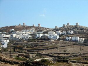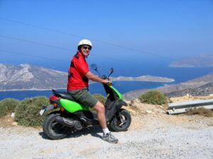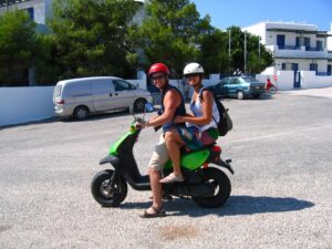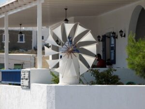 At 1130 am, we pulled into Katapola harbor, and were able to disembark the cruise fifteen minutes later. As we were walking past a waterfront café, a strong gust of wind suddenly blew several table umbrella stands away, as well as overturned a heavy potted plant. This set the locals off scrambling to prevent further damage. As we were soon to find out, it was a prelude of things to come. The Greek meltemi (heavy fall winds) had finally caught up to us! We ended up finding Thomas Auto-Moto rental at the far end of the harbor, and rented two scooters for 13 Euros/day each (including full comprehensive insurance which was highly recommended, or 10 Euros without). Thomas accepted Euros cash or coins only, and after paying up, we headed uphill towards the Chora. The wind was blowing briskly, and we were amazed at how powerful it felt. It was a bit scary riding on the back of a scooter with strong gusts of wind blowing full force at random intervals…but it was also really invigorating. Thankfully, all of us had the foresight to wear sunglasses today, as we desperately needed them to keep the windswept debris out of our eyes. Goggles would have been better, but at least the sunglasses provided us with some protection.