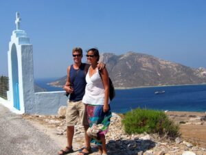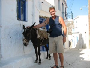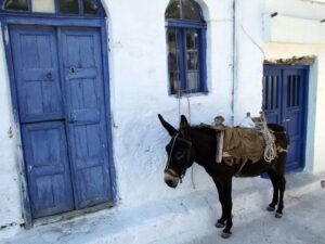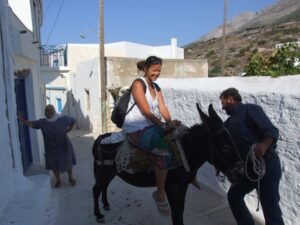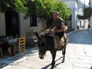 Once in Lagada, Becky befriended some locals who kept trying to persuade her to ride their donkey (in a skirt no less!). After a bit of convincing, she hopped up and the villagers laughed at her riding style (she just hopped into the saddle and sat astride the mount). One of the villagers showed her how the locals ride donkeys, and he hopped up and side straddled the donkey, gave it a swift kick in its hind legs, and off they went. Very cool experience and everyone got a big kick out of their donkey rides. Bidding farewell to our newfound friends, we wandered around Lagada and admired its twin domed church before hopping back on our scooters for the drive back to Chora.