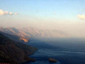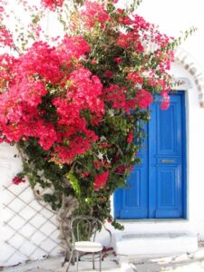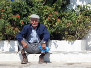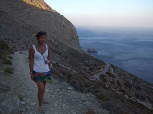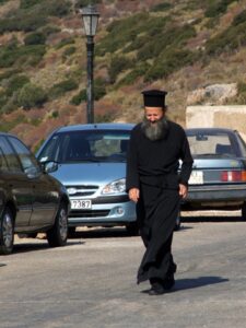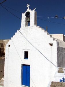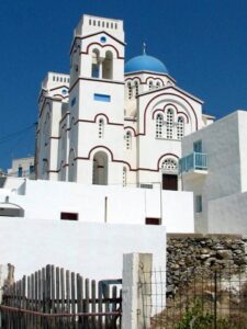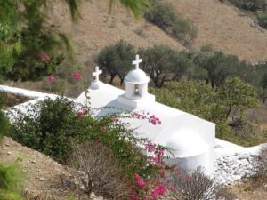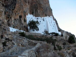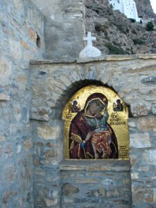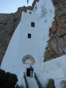 Our LP guidebook has this to say about Hozoviotissa Monastery, “a visit to the 11th century monastery is unforgettable, as much for the spectacular scenery as for the monastery itself. The dazzling white building clings precariously to a cliff-face above the east coast. A few monks still live there and tours are sporadic, but worthwhile and free…a great round trip is to catch the bus from Katapola to Hora, stroll the length of Hora’s main street and on to an upper car park below a radio tower. Go down to the right of the car park viewpoint, through a gate and then follow a zigzag track with exhilarating views to reach the road. Turn left here to reach a junction, the left branch of which leads in 500m to the monastery.”