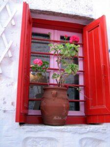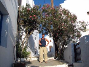 After parking our mopeds in one of Hora’s parking lots, we were afraid the blustery winds would knock them down. The winds were blowing something fierce…and we decided to walk into the Hora’s labyrinth streets in a vain attempt to escape from the strong gusts of wind. Bob and Ann decided to stay in beautiful Hora to admire its white houses and maze-like streets and relax a bit, while we were keen on completing our pilgrimage to the Monastery of Hozoviotissa. Little did we realize at the time, but this would require us walking uphill both ways! Yeah, yeah…we all remember the jokes our parents used to tell about how they used to have to walk barefoot in the snow, uphill both ways to get to school…but in this case, we really did experience the unique art of getting our butts kicked twice during our afternoon hike.