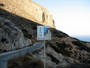 After we read that, we figured it was a fairly easy, straightforward and short hike…but once we followed these directions, we realized that the hike was not that short! It took us at least 20 minutes to get from the town of Hora to the road (all downhill on the zigzag path), and another 20 minutes to get from the road to the entrance of the monastery (all uphill).