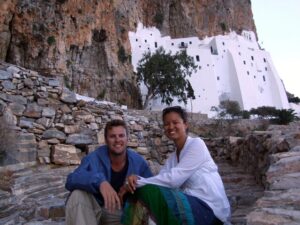 The trademark of Amorgos did not disappoint, and we were glad we made the effort to visit. The monastery is built right into the cliff-face and appears to be an apparition out of the rocks, plus it has an incredible view out to the sea. The friendly monk met us with greetings of “Kaleespera” (“good evening” in Greek) and guided us up into the interior of the church (where donations are accepted and candles can be obtained), and after we had tired of the amazing vistas on the monastery’s balcony, we headed back in and the monk led us into a waiting area where rakomelo (a sweet Amorgos beverage made from raki, cinnamon, cardamom, regional herbs and honey) and water were served. How cool was that…getting served alcohol from a monk inside an incredible monastery?
