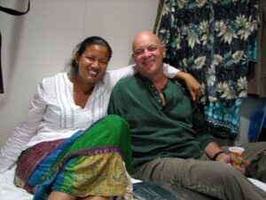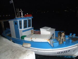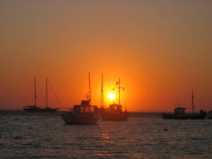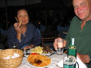 The meltemi winds didn’t die down with the sunset, so we snuggled on the scooter together and inched our way from Chora to Katapola, against some fierce wind resistance. More than once, we thought our moped would literally be swept off the roads from the gales of wind, but somehow we managed to arrive to Katapola unscathed, reuniting with Bob and Ann who had long given up on us up at Chora. We returned our rentals, and headed back to EasyCruise to freshen up and grab a couple pre-dinner drinks, before heading back out into Katapola for dinner.