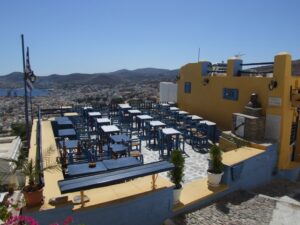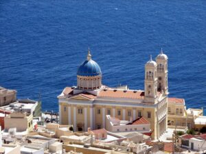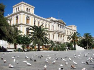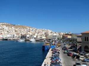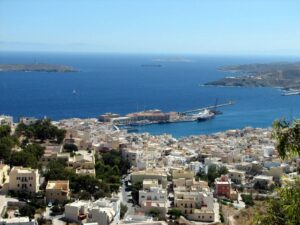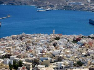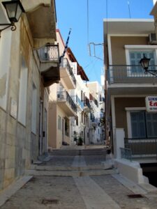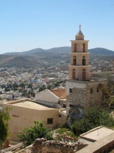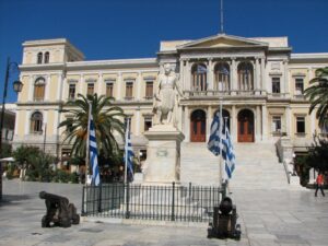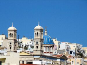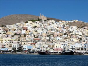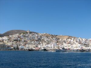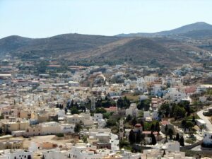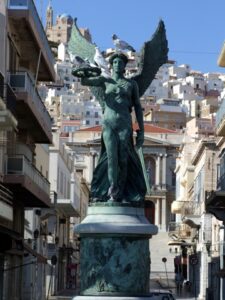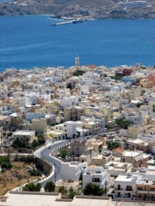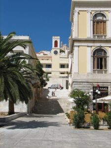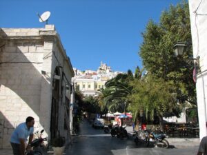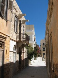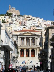 Syros sounded really interesting, and we were quite keen to see what this handsome Cycladic Island had to offer. After a quick glance at our Greek Island guidebooks, we opted to forego renting mopeds, and calculated that we’d be able to find plenty to entertain us at Ermoupolis, the Cyclades largest city and capital (named in honor of the winged messenger “Hermes”, the god of commerce, communication, and travel).