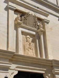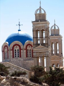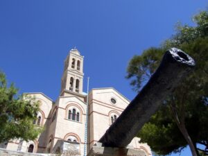 As we were pulling into the harbor, we could easily see how beautiful Ermoupolis is…the eclectic Greek, Italian, and Bavarian architectural designs combined with pastel colors and wrought-iron balconies lent a certain romantic atmosphere to the entire city. We disembarked the cruise and strolled along the waterfront, admiring the scenic views. Right away it became obvious to us that our main goal for the day would be to climb up to the two dominant lookout points for a panoramic view overlooking the city. The first lookout point was the Greek Orthodox Church Anastasis, and it stood on a promontory that was almost a vertical shot from the gorgeous Plateia Miaouli, one of the greatest squares in the Cyclades.