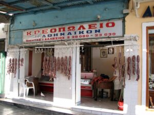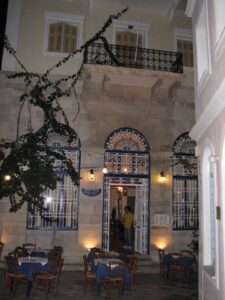 We also had finally decided upon a restaurant for the evening. Our plan was to make our way back to the main plaza, find Souri Street and follow it to the very end. This was based on our guidebook’s recommendation of dinner at Thalami Ouzeri Psarotaverna, “which is a stylish restaurant that occupies an old waterside mansion on Agios Nikolaos Bay. The sea serenades you, the fish dishes are prepared with style. Reasonably priced treats, such as mussels in wine sauce, or kakavia (local soup of fish, onions and tomatoes) are only part of the excellent menu.” Sounded like a winner to us, and dinner ended up being very tasty with a romantic view to boot. After dinner, we checked out the interior of the mansion-cum-restaurant, which surprised us with its 20 foot high ceilings, and gorgeous interior.