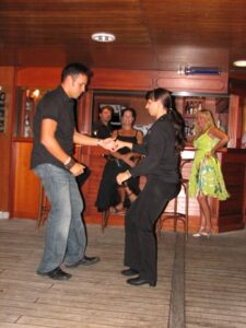 A session of salsa dancing lessons on the fifth deck at the Sun/Moon bar led by Dario rounded out the rest of our evening. Lessons started just before midnight, and surprisingly, almost everybody mastered the basic steps (forward basic, backward basic, and side step). After teaching us the basics, Dario told us that the ladies only had to remember the backward basic, while the men would be responsible for the forward basic and side step. By evening’s end, everyone was doing some semblance of a salsa dance on the dance floor, and it looked like folks were having a great time.