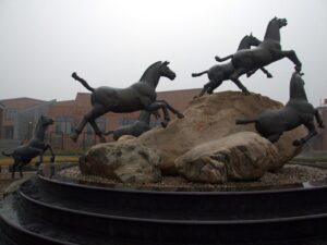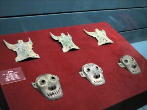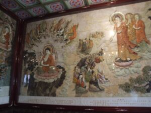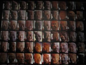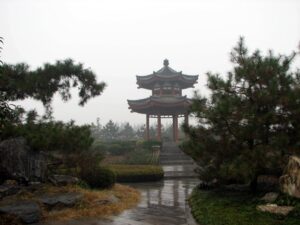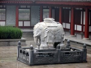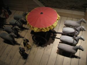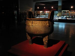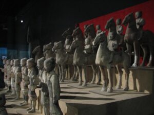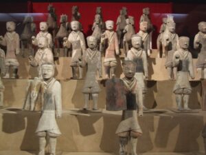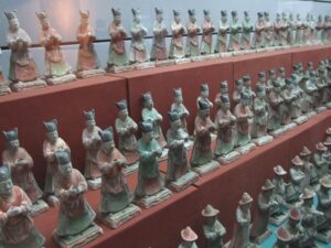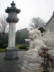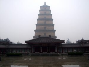It was lunch time, so we headed back towards Xi’an where we stopped at the Horizon Restaurant for a Cantonese meal. Our hostess led us to our very own private room with a personal waitress who was at our beck and call. Chen had given us a picture book and told us to make our own selections, so we simply pointed at what looked good. We ate deer ribs, pork in a hot pot, noodle soup, lightly grilled vegetables and fried rice. Lunch was excellent and we definitely overate again today. Immediately after lunch, we paid a visit to the Big Wild Goose Pagoda. The rain had lightened up somewhat, but the misty weather made it difficult for us to get a good luck at the pagoda. Jiali gave us a complete rundown on the life of Buddha, Buddhism and its influence into Xi’an and then China. We later found out that this topic was a source of passion for her, as she had recently converted to Buddhism. Lucky for us, as Chen really knew her stuff when it came to Buddhism. Because our original Tibet flight had been cancelled and we were rescheduled on an earlier flight, we had to squeeze our Xi’an itinerary down to 2 days. So instead of lounging around this afternoon, we visited the Provincial History/Shaanxi Museum where we followed Chen around while she gave us an excellent rundown on the highlights of the displays. A large section of the museum was under renovation, just in time for the 2008 Olympics.