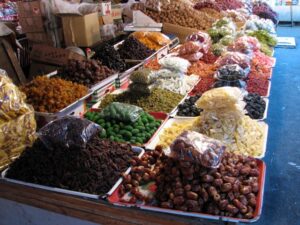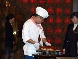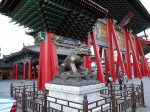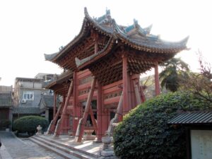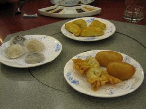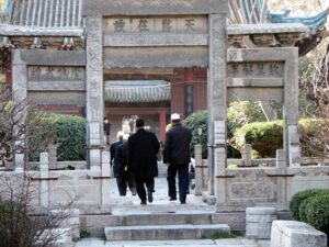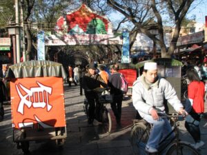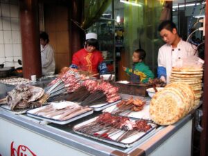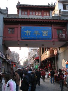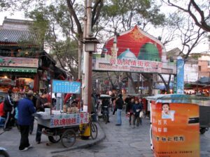Next stop was a visit to the Muslim quarter’s Great Mosque. We passed by the Bell Tower, which stands right in the heart of Xi’an’s old city, and pulled up right under the Drum Tower. From here, we walked through the base of the Drum Tower and into the Muslim district towards the mosque. We found out later that the Drum Tower is now a drum museum which showcases numerous drums dating back hundreds of years. The top of the tower has a beautiful panorama of the entire city. We were more interested in the sights and sounds of the Muslim district, where food smells drifted down the street, and all sorts of snacks and foods were for sale. To get to the mosque, we had to walk through a colorful side street bazaar that was reminiscent of Istanbul’s bazaars. We were amazed to see so many Chinese Muslims in Xi’an. But of course, since Xi’an was the one-time capital of China and the terminus for the old Silk Road, it should come as no surprise that there are over 50,000 Muslims in Xi’an. The Great Mosque could have been mistaken for a Chinese temple as there wasn’t much difference to distinguish the two. It is China’s largest mosque, and is laid out in Chinese style among gracious gardens and elegant pavilions. We came during the afternoon prayer service, so hundred of male Muslims filtered in towards the worship hall. Chen explained that female Muslims are not allowed to enter the worship hall, and have to pray in private at their homes instead. We weren’t ready to leave this colorful district yet, so we told Chen that we’d just walk back to our hotel after having some free time in this area. Then we wandered back to the Muslim Street to check out the amazing selection of Muslim food. After buying some delicious dates for a few yuan, we strolled down the backstreets watching as vendors prepared fresh pancakes, noodle soup, shish kebabs, roasted nuts, and various other snacks. Food sold on the street is tasty and reasonably priced…we loved this part of Xi’an and were so glad that we decided to extend our stay here.