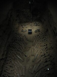 2 Dec 07 Xian: A late start of 10 am allowed us a rare morning to sleep in. After breakfast, we linked up with Jiali and headed towards the Hanyangling Museum and Mausoleum of Han Emperor Liu Qi, which was close to the Xi’an airport. The museum/mausoleum complex had recently opened in 2006, hence it was not listed in our Lonely Planet China guide. Jiali explained that this morning, we were going to see more terracotta warriors. The warriors were Han Dynasty warriors, and when compared to their more famous Qin Dynasty brethren, measured only one sixth the size of the Qin warriors. Archaeologists had spent the past 30 years excavating this site, and had discovered over 40,000 terracotta warriors! In addition to the warriors, entire formations of terracotta pigs, goats, horses, sheep, and bowls were also unearthed. Many of the excavations were displayed beneath the museum’s glass floor. Due to the unique design of the museum, all visitors were required to wear protective plastic bags over their shoes, to prevent scratching the glassy surface. After wandering around the complex, we culminated our tour at the museum’s theater complex. The “film” instantly reminded us of the technology used when the three-dimensional hologram image was projected from R2D2 in the 1977 movie Star Wars. Remember Princess Leia popping out in 3-D leaving a message? Well, in this case, we got an entire reenactment of key moments in the Han Dynasty, all via 3-D hologram images…very cool concept. The Hanyangling museum gets two thumbs up for being new, innovative, and informative!