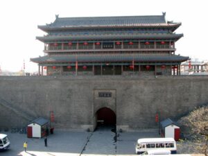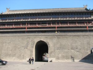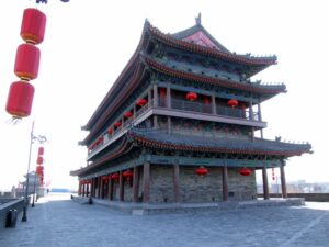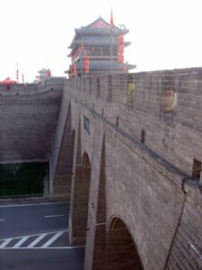 Our afternoon agenda was carefree. We were to visit China’s oldest and best preserved city wall. Xi’an’s fortified city walls are in immaculate shape, measuring 12 km in circumference, and encircling 12 square km of the old city. The wall was built by the Ming Dynasty in 1370 and its walkways are broad enough to host marathons atop the city walls! Most visitors today choose to stroll or ride bikes along the city walls, and it makes for a pleasant visit. Chen gave us a nice rundown on the city walls, explaining that the ramparts are built exactly 120 meters apart. This was done to provide sufficient coverage for the arrows which could only reach 60 meters in any one given direction. We saw replicas of weaponry used such as catapult, cannons, ladders, and shields.