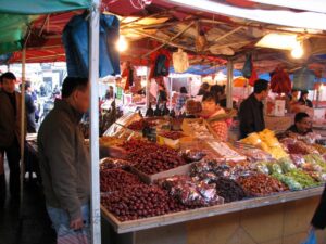 While walking back towards the western gate, Robby realized that he needed to restock on some deodorant. Little did we realize we’d start our odyssey to find some. After wandering in and around numerous stores, we finally happened upon a “Trust Mart” store. Just think of a mega Wal-Mart and you’ll know what Trust Mart was like. Well of course a store this big has to stockpile deodorant, right! We thought so, and first had to run through the gauntlet of fruits and vegetables. First floor was a bust. Second floor was the clothing and shoe department…also a bust. Third store looked more promising, with rows of toothpaste, shampoo and soap. However, no deodorant. After finally mimicking “roll on deodorant” to a nearby salesclerk, we were pointed towards the razor section. Finally, Robby took to smelling his own armpits and making a “roll on” motion. At this point, the exasperated salesclerk finally realized what we were after, and little did we know but it’s a novelty item! We were then directed towards the Avon lady and she wrapped up our bottle as a luxury item and handed us a special slip to give the checkout clerk. Wow…what an ordeal! But we did manage to find some women’s brand deodorant for Robby, ha ha.